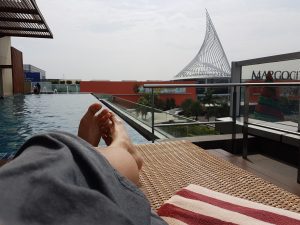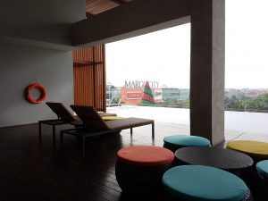 Tapi kok ya begitu ngeliat kolam renangnya yang ternyata berkonsep infinity pool ini saya malah jadi tergiur yak. Yaudahlah akhirnya memutuskan buat pulang ngambil baju renang tok. Pesen GoJek bolak balik hotel-rumah-hotel, wekekek.
