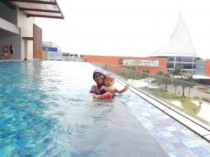 Ini nih kolam renang yang bikin saya mesti balik lagi ke rumah demi ngambil baju renang, hyehehe. Saya itu emang suka males bawa-bawa baju renang kalo staycation atau nginep yang gak terlalu lama gini. Males renangnya sih sebetulnya, soalnya gak bisa berenang, buahaha. Jadi ya biasanya Naia & papanya aja yang berenang, saya ngepak tas untuk bersiap check out.