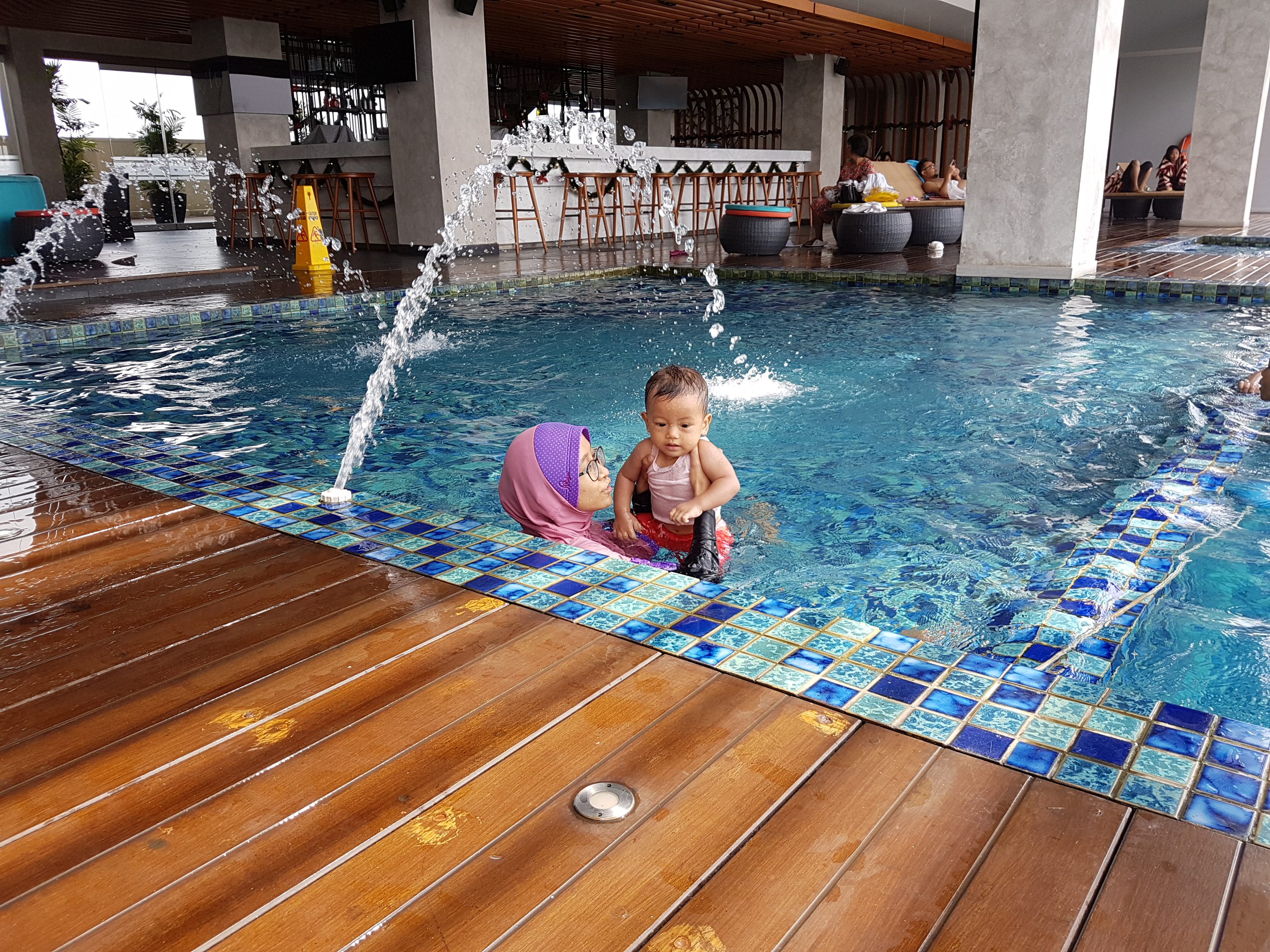 Ini nih kolam renang yang bikin saya mesti balik lagi ke rumah demi ngambil baju renang, hyehehe. Saya itu emang suka males bawa-bawa baju renang kalo staycation atau nginep yang gak terlalu lama gini. Males renangnya sih sebetulnya, soalnya gak bisa berenang, buahaha. Jadi ya biasanya Naia & papanya aja yang berenang, saya ngepak tas untuk bersiap check out.