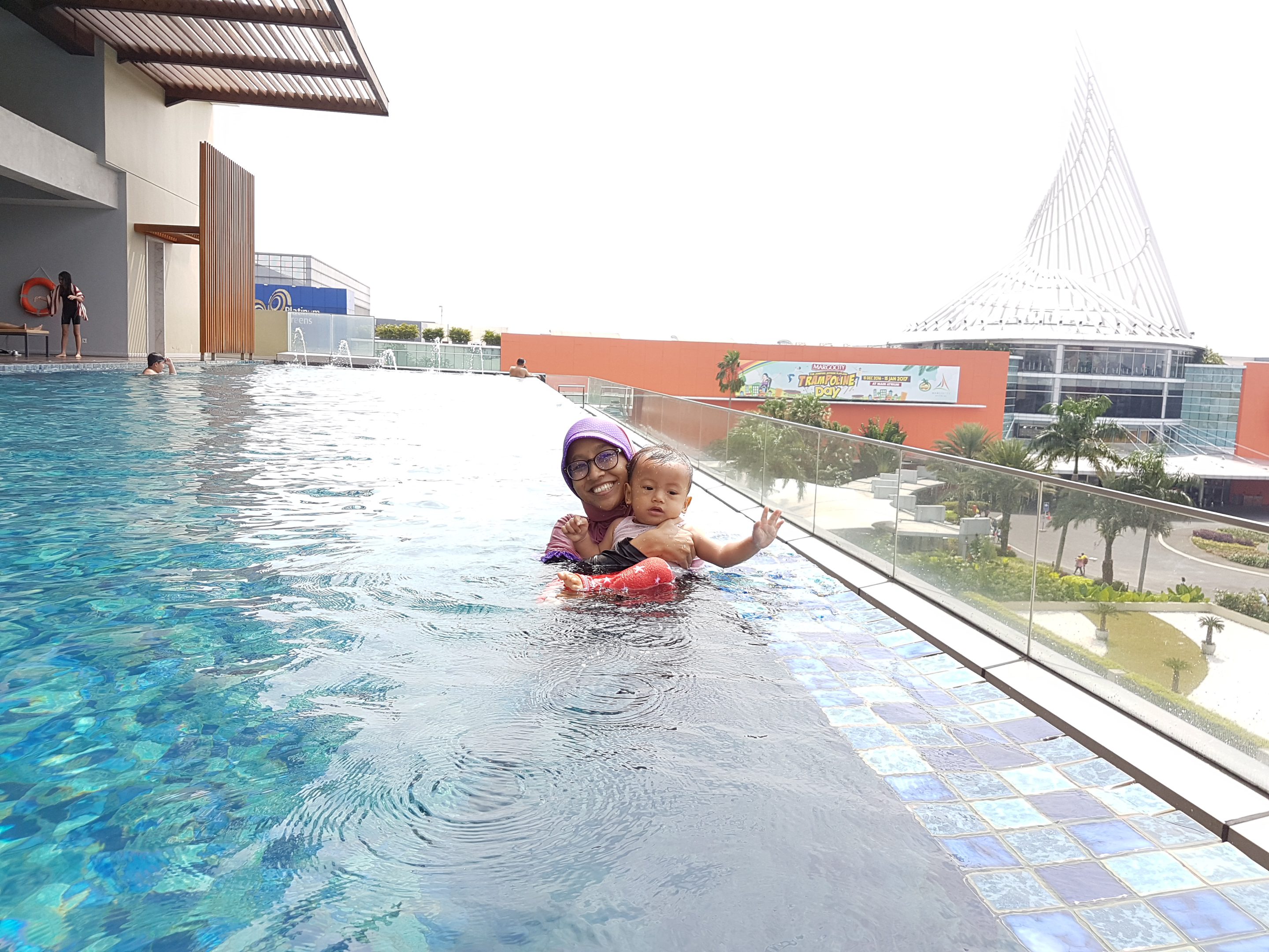 Tapi kok ya begitu ngeliat kolam renangnya yang ternyata berkonsep infinity pool ini saya malah jadi tergiur yak. Yaudahlah akhirnya memutuskan buat pulang ngambil baju renang tok. Pesen GoJek bolak balik hotel-rumah-hotel, wekekek.