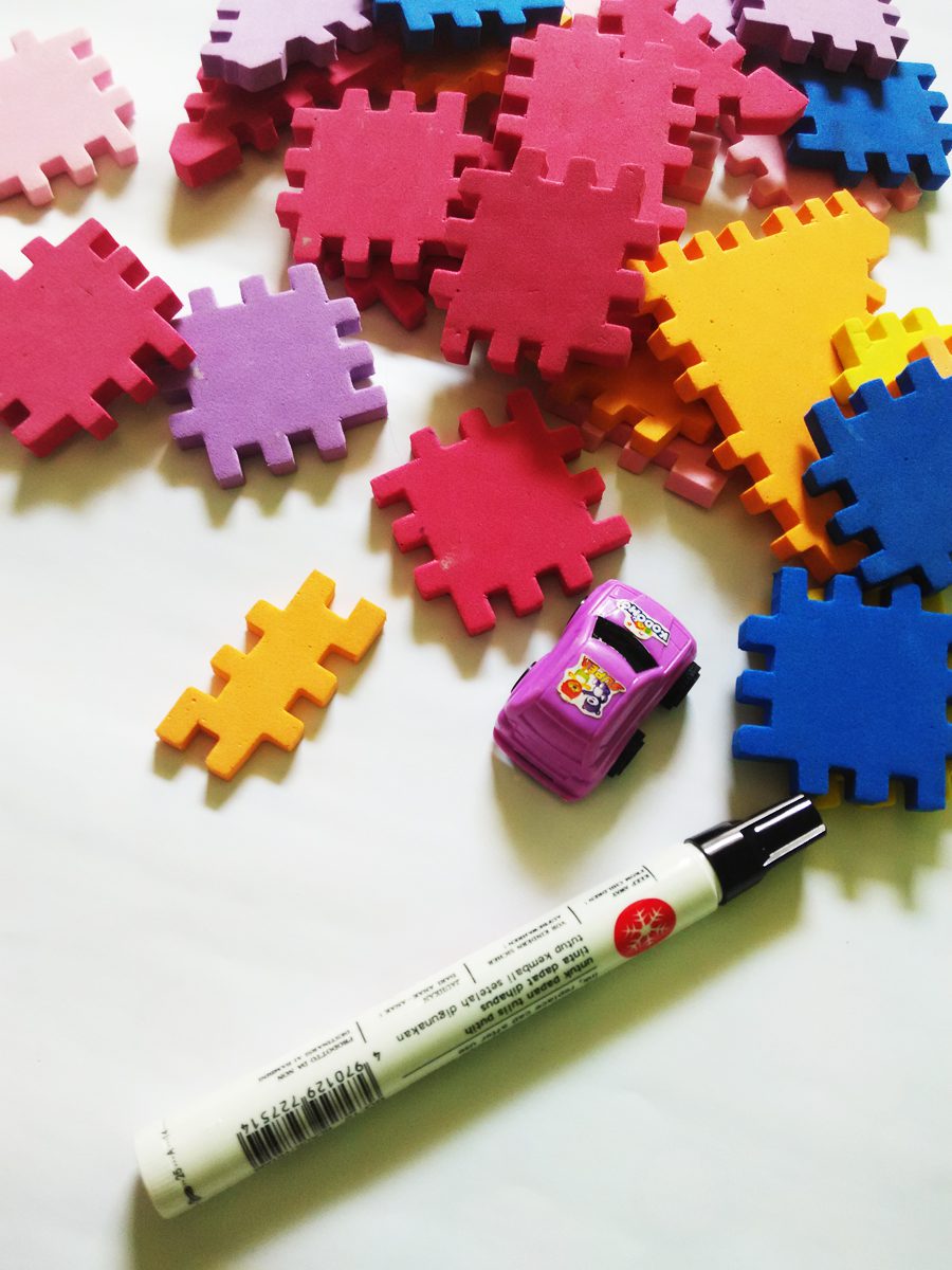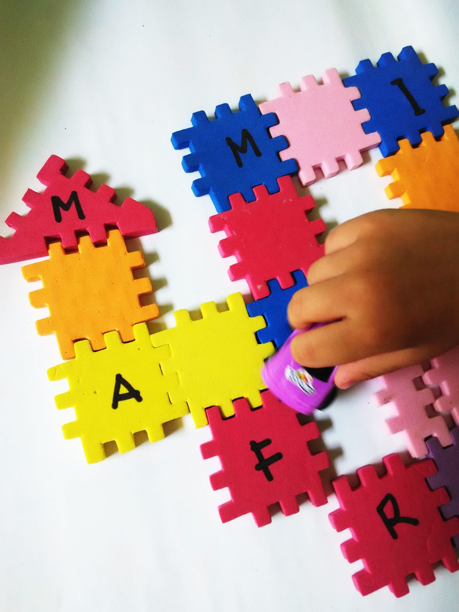 - Tulis huruf-huruf penyusun nama anak di beberapa puzzle mat di sepanjang perjalanan menuju rumahnya.