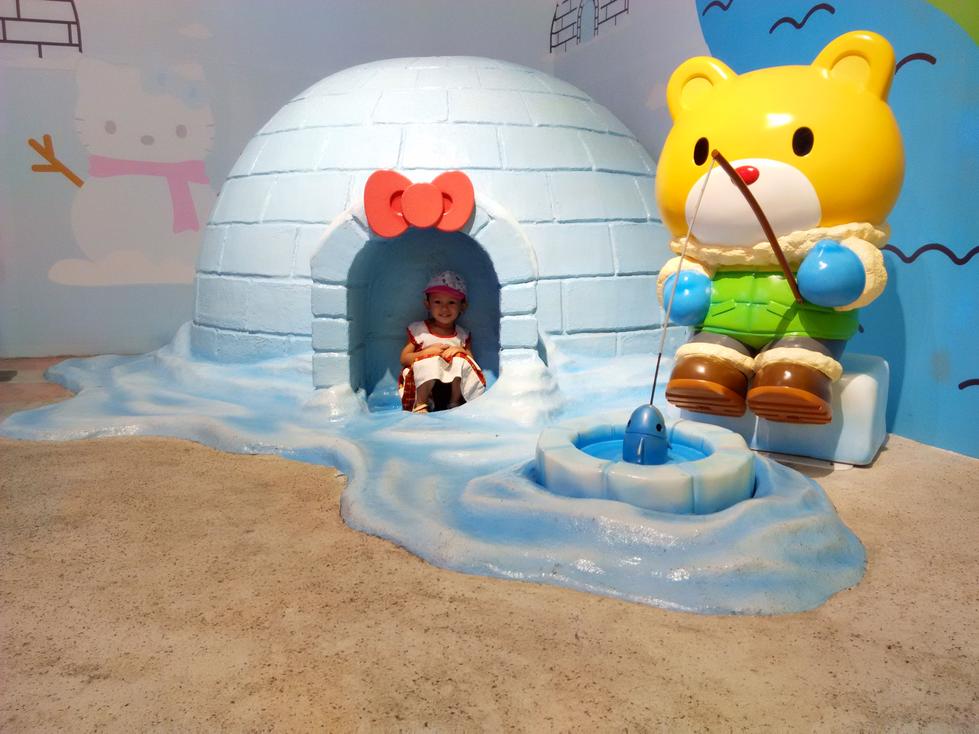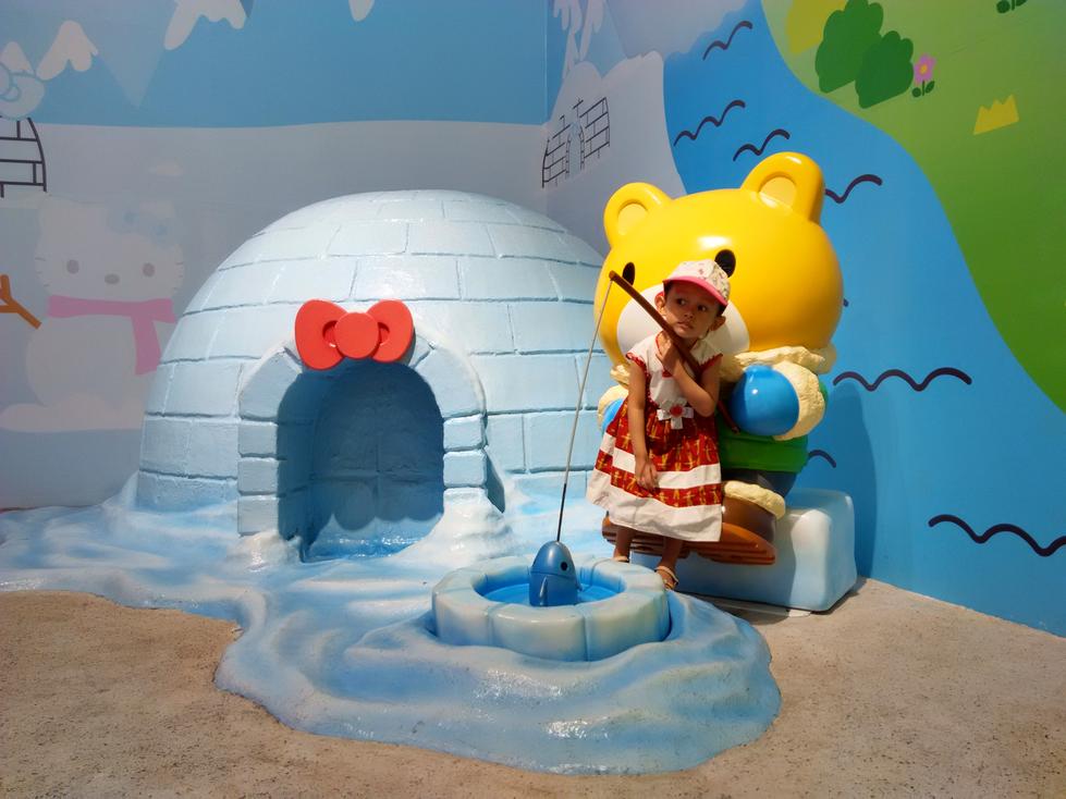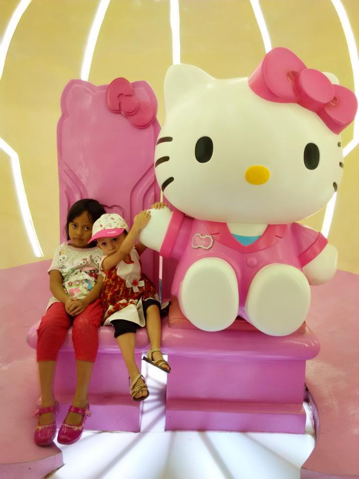 Selain itu ada juga ruangan Hello Kitty, tempat anak2 bisa berfoto bersama Hello Kittynya. Di sana ceritanya Hello Kitty berkeliling dunia, makanya ada beberapa ikon tempat khas dunia. Naia suka banget nih foto-foto di sini. Antusias dengan Hello Kitty-nya siih, sampai menggandeng tangannya Hello Kitty tuh saat difoto 😀
