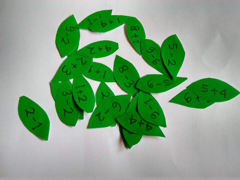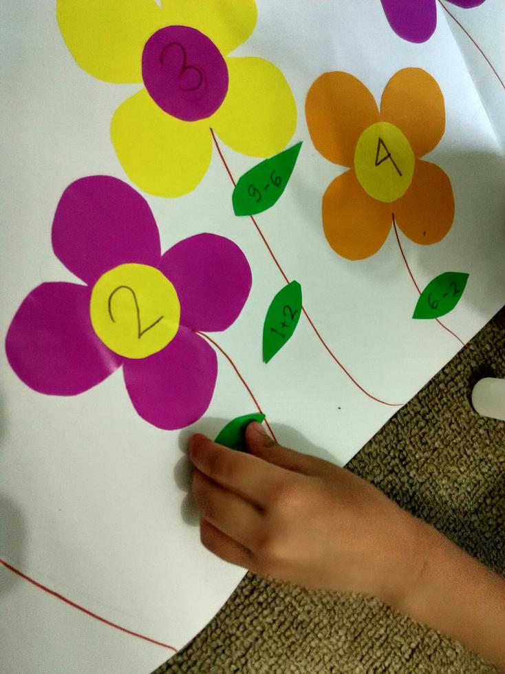 - Tulis operasi penjumlahan di daun-daun yang telah disediakan. Ajak anak untuk menempelkan daun di bunga yang sesuai. Misal operasi penjumlahan di daun adalah 4+5, maka, tempel daun tersebut di angka 9.