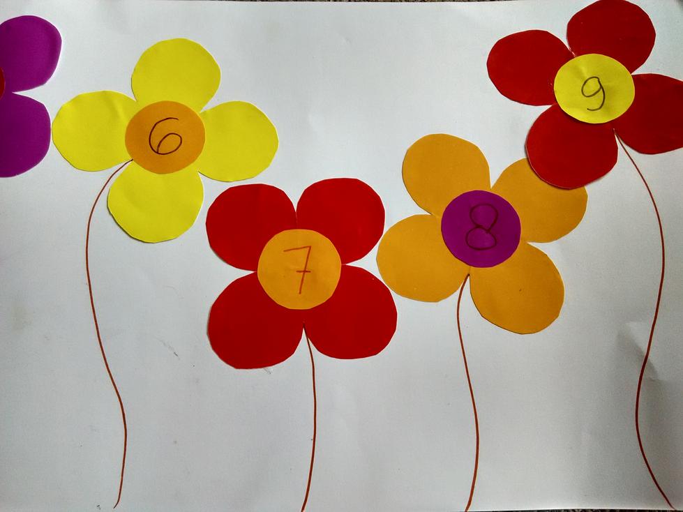 - Buat bunga dari kertas origami warna-warni sesuai jumlah angka yang kita inginkan. Kebetulan saya sih pakai angka 1 sampai 9. 2D aja kook, gak pakai lipet-lipet origami segalaa, hehe. Bikin daunnya juga ya yang banyak. Karena daun inilah bagian terpenting dari mainan ini