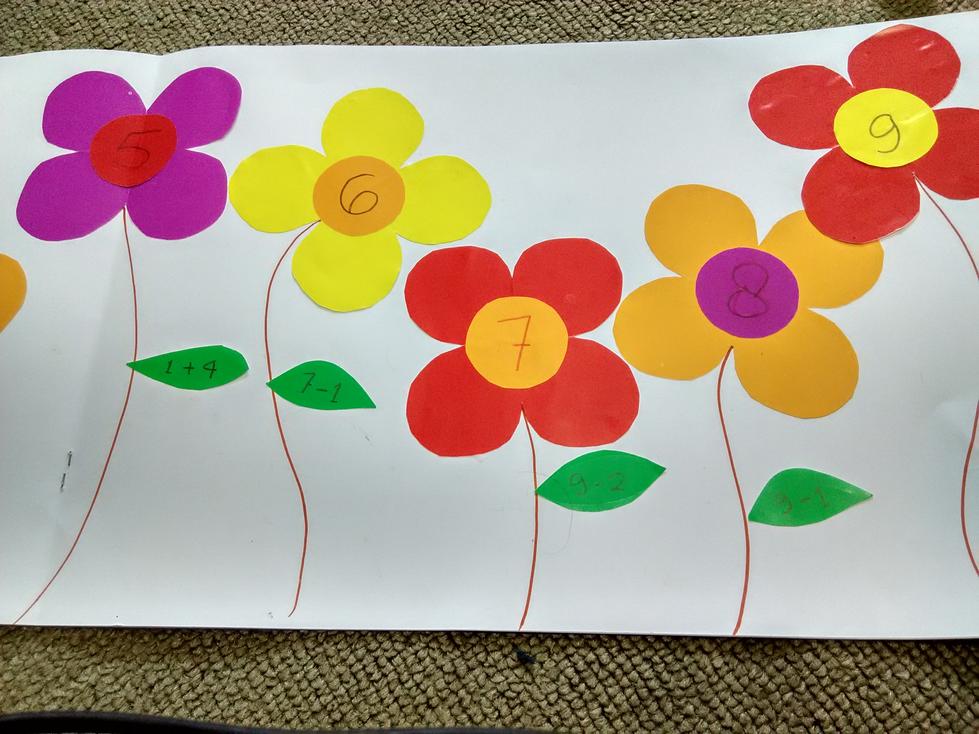 3. Tulis operasi penjumlahan di daun-daun yang telah disediakan. Ajak anak untuk menempelkan daun di bunga yang sesuai. Misal operasi penjumlahan di daun adalah 4+5, maka, tempel daun tersebut di angka 9.