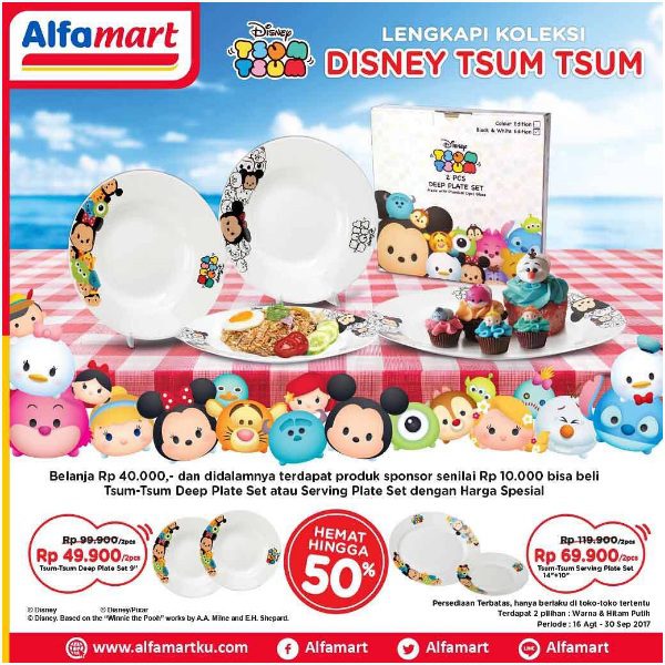 Promo ini berlansung sampai akhir November loh ya. Eh, Tsum-tsum cuma sampai 15 November deng, jadi ayok gih sana buruan ke Alfamart untuk tebus langsung KIMI dan Tsum-tsumnya sebelum kehabisan. Saya aja hampir kehabisan loh kemarin. Ngincer yang deep plate set padahal, tapi udah habis, huhuhu. Ini aja saya dapet yang berwarna tinggal 1, sisanya edisi hitam putih. Tapi tetep cakep kok edisi hitam putih juga, gambarnya itu loh yang pasti gak bakal ditolak sama anak-anak 😉