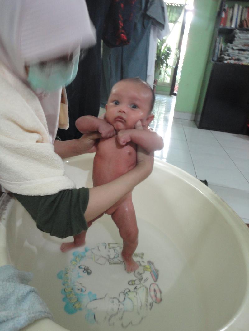 Saya sendiri memandikan Naia dengan air hangat dan terkadang air dingin. Jujur saja, sebetulnya saya bukan termasuk orangtua yang peduli suhu air, yang katanya harus disesuaikan dengan tubuh bayi tadi. Mungkin ketidakpedulian saya itu yang menyebabkan kulit Naia terkadang iritasi dan merah-merah. Biasanya sih kalau sudah begitu saya memberinya lotion bayi setelah mandi. Alhamdulillahnya, beberapa hari biasanya merah-merah itu hilang.