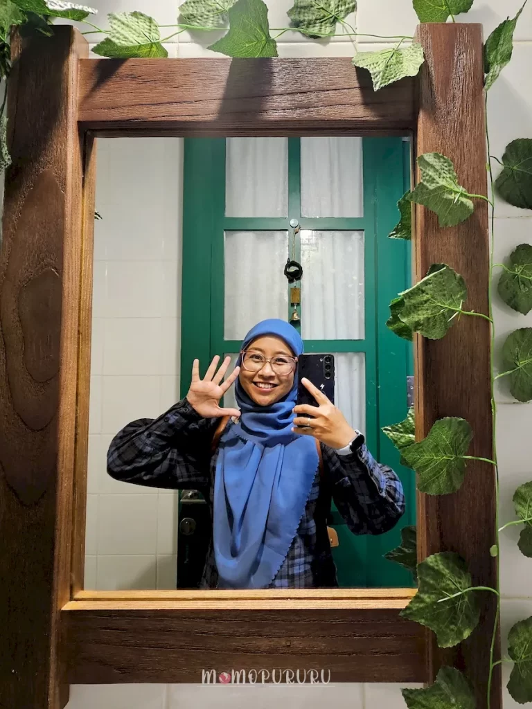 Wastafelnya ituu lho, memanggil-manggil untuk selfie, ahaha. Kacanya lumayan besar dengan hiasan daun yang mengelilingi frame kayunya soalnyaa.