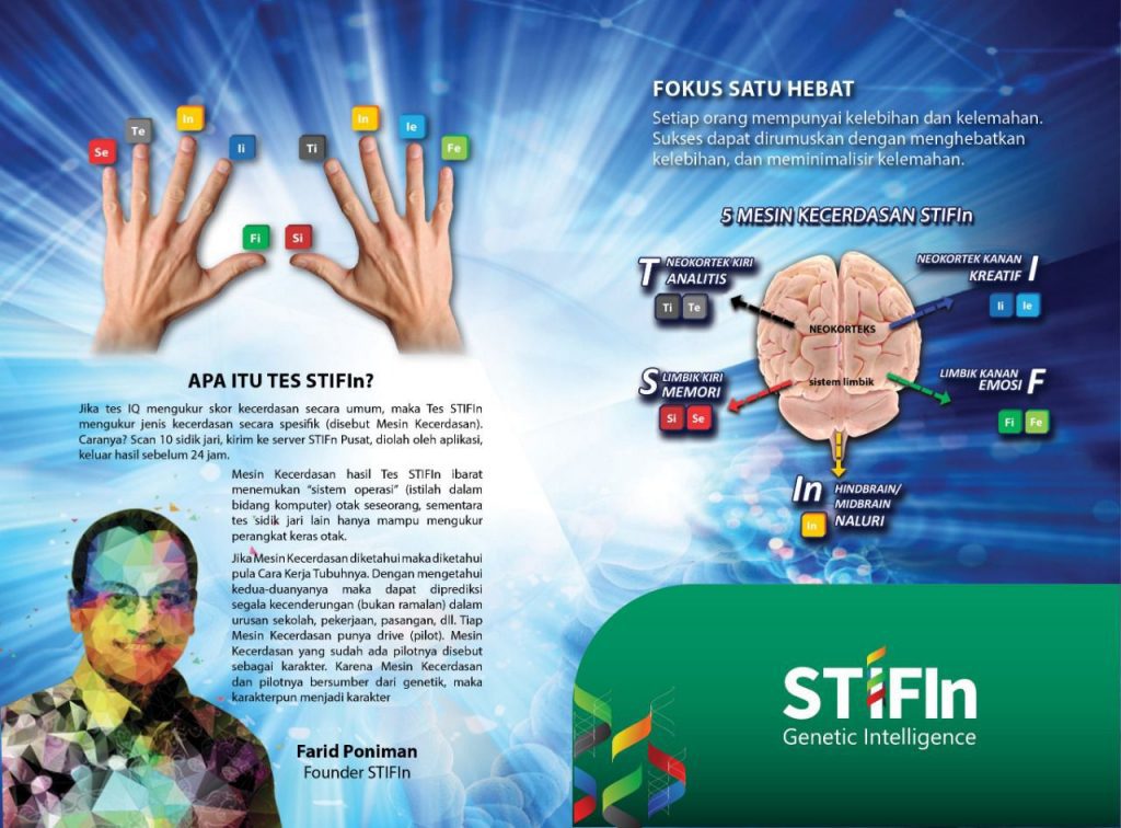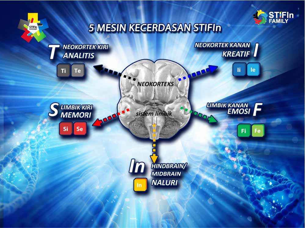 Dan baru tau juga donk aku donk kalau STIFIn itu adalah singkatan dari nama-nama mesin kecerdasan yang dimaksud. Ada Sensing, Thinking, Intuiting, Feeling, dan yang terakhir Insting. Masing-masing ini disebut mesin kecerdasan karena sebagaimana mesin kecerdasan pada komputer yang menjalankan seluruh proses dari komputer itu, STIFIn ini yang menentukan dan memengaruhi semua pemikiran dan semua tindakan yang kita lakukan selama ini. Istilah kasarnya, STIFIn ini “setelan pabrik” diri kita masing-masing.