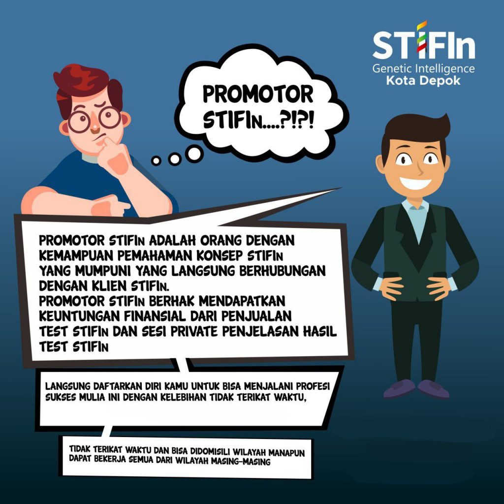 Promotor sendiri adalah profesi perorangan yang mampu untuk berhadapan dengan klien secara langsung. Berhadapan dengan klien ini maksudnya adalah dengan menjelaskan hasil tes yang didapat klien serta bisa menjadi konsultan. Jadi, promotor STIFIn adalah orang yang betul-betul paham setiap tipe kecerdasan serta seluk beluk tiap kecerdasan di STIFIn ini.