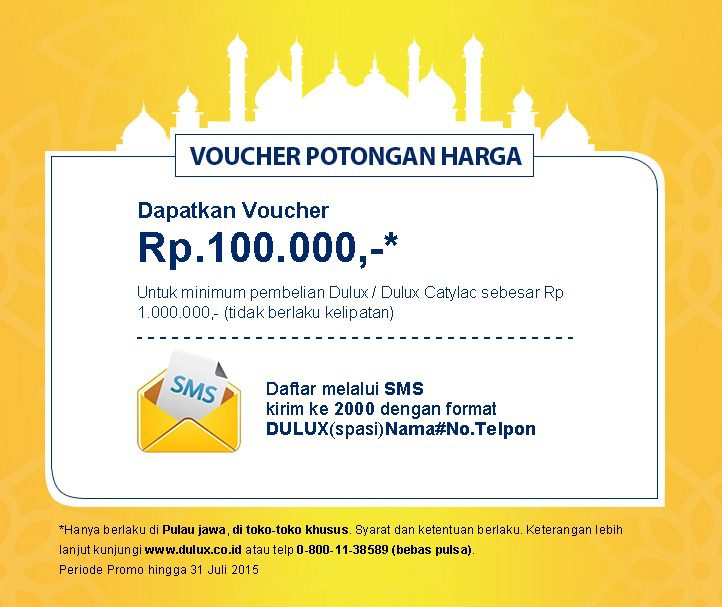 Oiya, berhubung saya sempat mau melakukan perubahan terhadap rumah (baca: mengecat tembok) dan mau menggunakan Dulux EasyClean, saya jadi cari-cari tau lebih banyak donk tentang Dulux. Ternyata ada promo warna-warni kemenangan loh, yaitu kita bisa mendapat voucher sebesar Rp. 100.000 dengan pembelian produk Dulux sebesar Rp. 1000.000. Lumayan lah buat sedikit menghemat 😀
