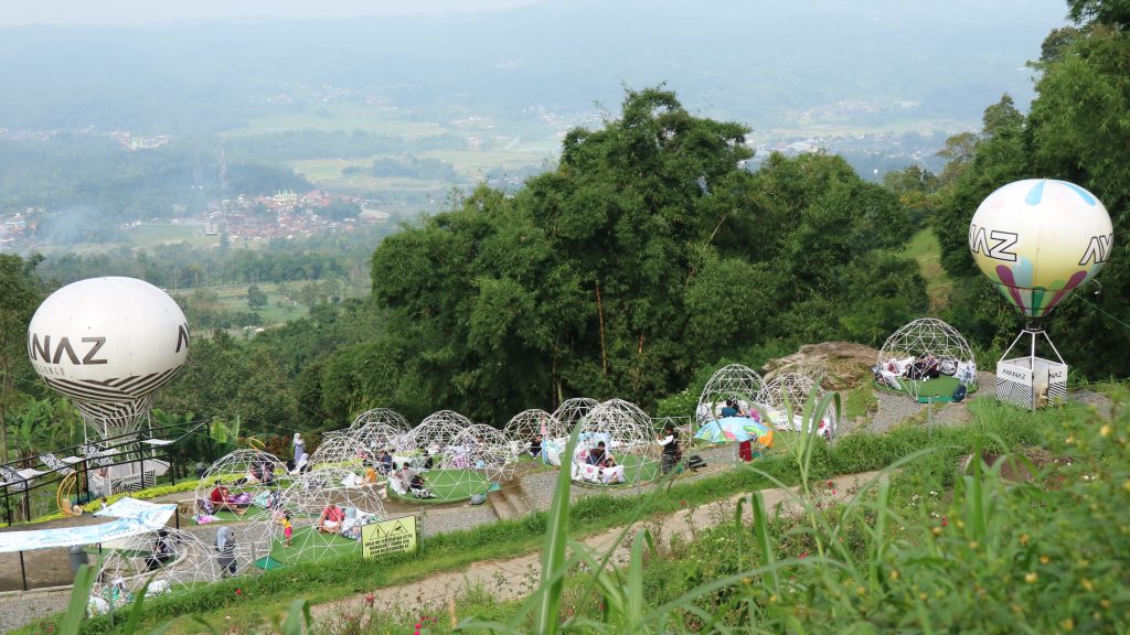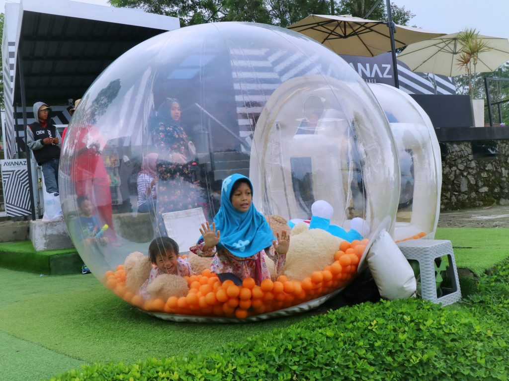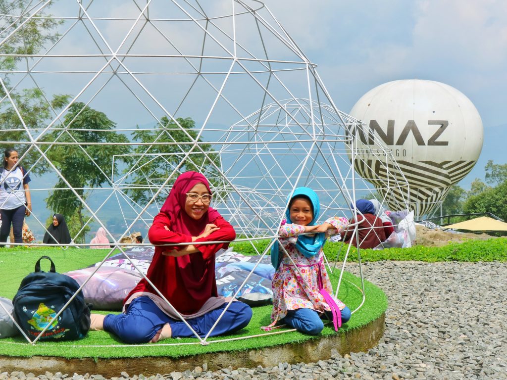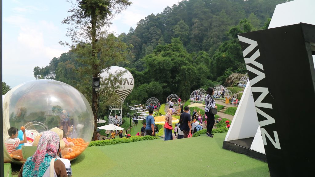 Nah, sekarang menuju wisata kekiniannya deh, namanya Ayanaz. Isinya itu spot-spot foto aja dengan beberapa macam bentuk spot foto. Ada yang berupa balon udara, tempat duduk di sekitar air, juga seperti di dalam keranjang kubah (nyebutnya apa ya ini ya, hee)
