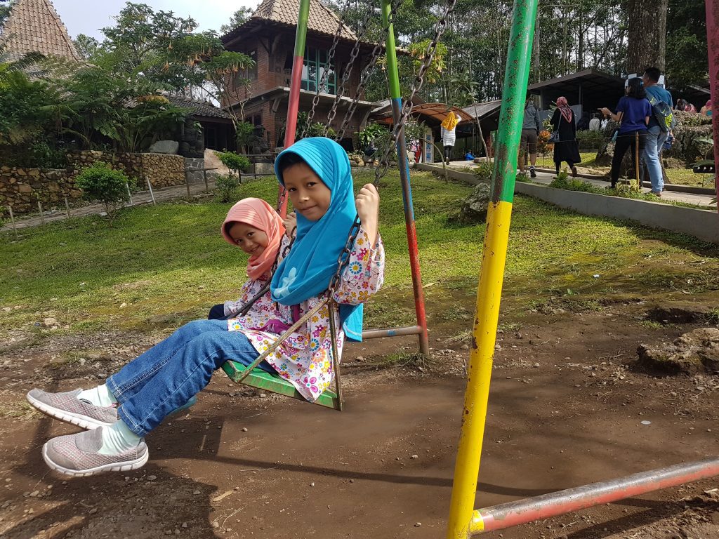 Akhirnya ya istirahat dulu di sekitar pintu masuk. Kebetulan di sebelah kiri setelah pintu masuk area candi memang ada tempat bermain anak, ya tinggal ayunan dan beberapa mainan aja sih, tapi lumayan bisa bikin anak-anak happy dulu sebelum memulai wisata candi atau hiking 😀