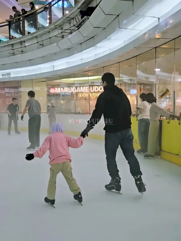 Buat teman-teman yang anak-anaknya baru pertama kali mencoba, saranku jangan langsung lepas tangan ya. Biarkan mereka berpegangan di pinggiran (railing) dulu selama 15 menit pertama buat merasakan sensasi es di bawah kaki mereka.