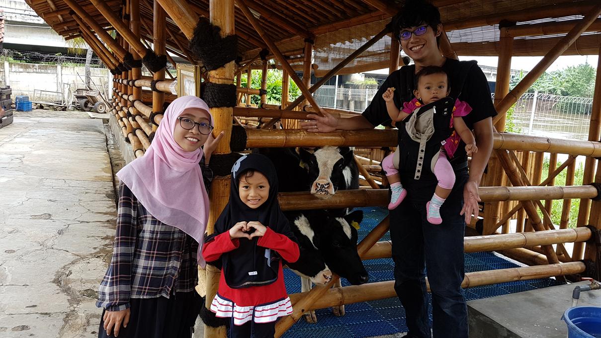 Kalau sebelumnya Naia ngasih minum susu ke cempe di D’Kandang Depok beberapa minggu lalu, kemarin Naia berkesempatan untuk ngasih minum susu ke anak sapi. Plus ngasih makan kambing. Ngasih minum susu ke anak sapi ini ternyata gak gampang euy, gak bisa kayaknya kalau anak kita dilepas sendiri. Bukan karena sapinya galak ya, tapi karena sedotannya kuattt banget banget. Mesti orangtuanya yang ikut megangin botol susunya juga. Waktu ngasih minum ke cempe sih Naia masih kuat laah sendiri tanpa dibantu saya, tapi kalau anak sapi ini udah gak bisaaa. Akhir-akhir aja malah dilepas sama Naia karena dia udah gak kuat nahannya, tinggal saya sendirian yang megangin botol susunya, hehehe.