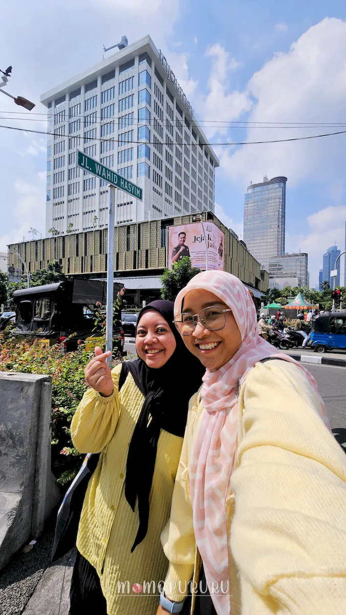 Tempat pertama yang kami datangi adalah Sarinah (kami pikir jawabannya jl. Wahid Hasyim). Jadi kami selfie di bawah papan nama jalan Wahid Hasyim ini.