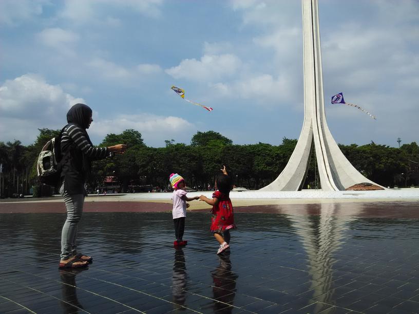 Kali ini saya tetep donk naik angkot. Dan berhubung hari kerja juga, jadi saya dan Gema cuma berdua dengan anak kita masing-masing deh, hihi. Saya dengan Naia, dia dengan Zalika. Kali ini saya masuk melewati pintu utama, ya walaupun harus jalan agak jauh sih dari turun angkot sampai pintu masuk (sampai alun-alun malah). Di alun-alun itu saya menemukan lagi banyak anak-anak TK yang sedang berkunjung. Mungkin ya memang TMII ini pengunjung setianya ya anak2 ini lah yaa, haha. Kalau gak ada mereka seriusan sepi banget deh ini Taman Mini.