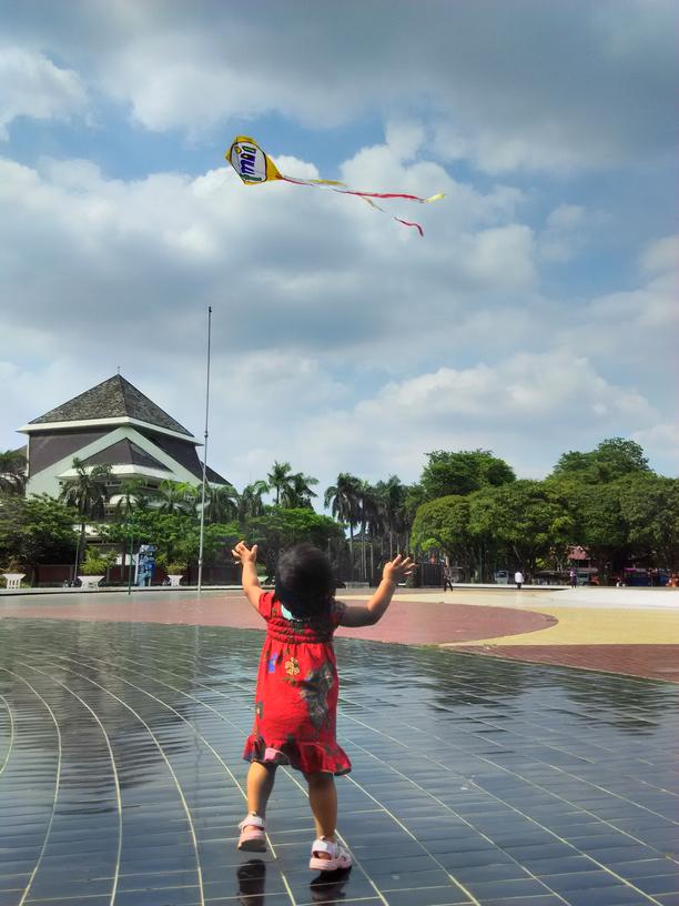 Setelah Gema dan Zalika datang, saya melakukan apa yang waktu itu dilakukan di alun-alun, main layangan! Karena Naia sudah lebih besar, jadi dia lebih bisa memegang layangannya sendiri, Zalika sih lebih suka mengejar layangan yang diterbangkan Gema, hihi.