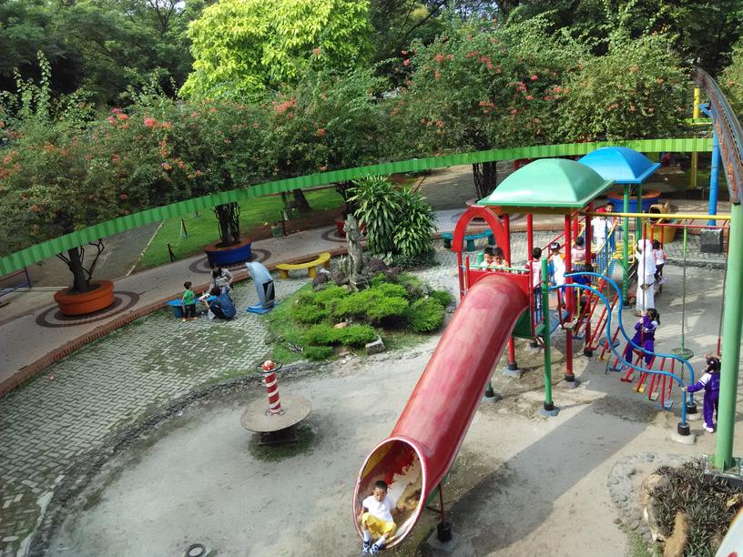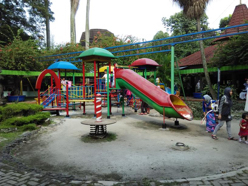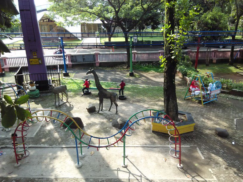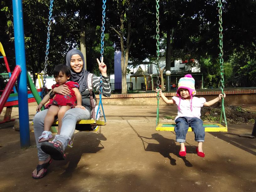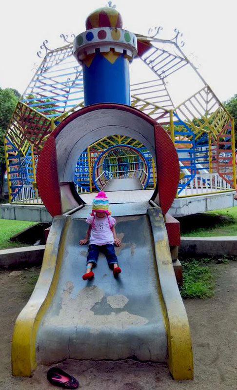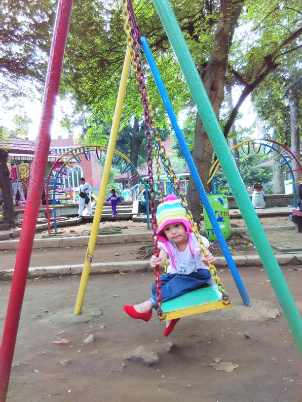 Saya waktu kecil sih pernah juga ke sini, tapi lupa pernah main apa aja, udah lama bok. Yang paling inget mah ayunan, karena saya emang paling demen ayunan. Ternyatah Naia emang anak mama banget, dia kemana-mana ya yang dicari ayunan juga 😀